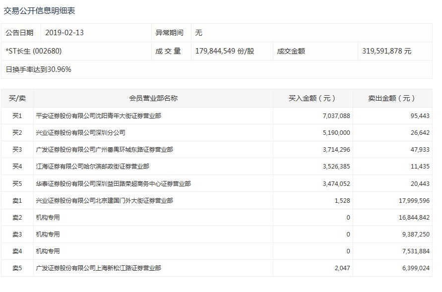 今日(2月13日)的*ST长生龙虎榜数据也显示,买方前5席均为游资。买入金额最大的是平安证券沈阳青年大街证券营业部,买入金额为703.71万元。值得一提的是,著名“游资敢死队”兴业证券深圳分公司与华泰证券深圳益田路荣超商务中心证券营业部都位列买方前5席。卖方前5席中有3家为机构专用,累计卖出金额为3376.4万元,买入金额均为0元。