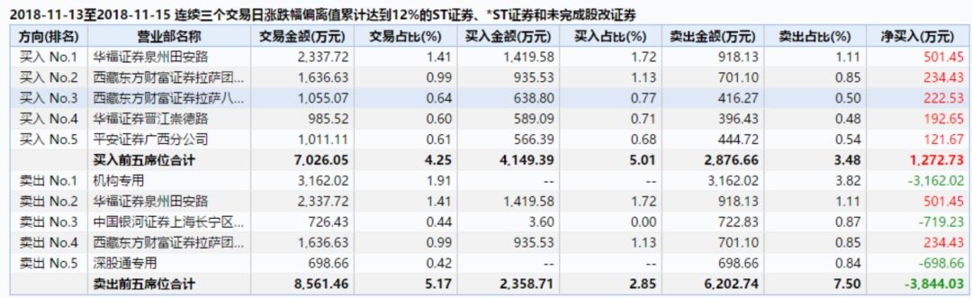 *ST长生龙虎榜数据显示,2018年11月13日至11月15日期间,买入*ST长生金额最大的前两家券商营业部,分别为华福证券泉州田安路证券营业部和西藏东方财富拉萨团结路第二证券营业部,买入金额分别为1419.58万元和935.53万元。同期,某机构专用席位卖出金额高达3162.02万元,买入金额为0元。另外,深股通专用席位的卖出金额为698.66万元,买入金额为0元。
