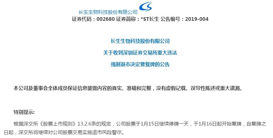 1月14日,*ST长生发布公告称,公司收到深交所《关于对长生生物科技股份有限公司股票实施重大违法强制退市的决定》,公司股票于1月15日继续停牌一天,于1月16日起复牌。*ST长生由此成为重大违法退市第一股。