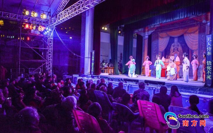 傍晚,鞭炮声四起、焰火映空,放下筷子的男女老少聚到村广场前,听曲看戏。“每年这天我都跟大人出来看大戏。”一名10来岁的小孩拉着奶奶的手腼腆地说。美国小伙亚历克斯也是粤剧迷,他在广州生活了12年,这次特意连夜坐车来到化州看春班戏,“很难得能看到这么原生态的戏曲艺术,这次粤西之行收获很大。”