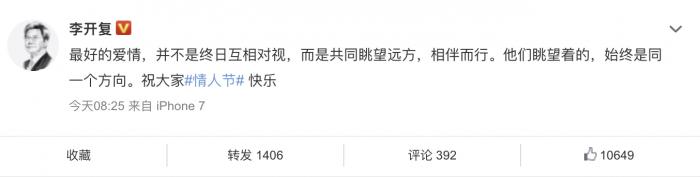 创新工场董事长李开复也通过微博送出祝福,他表示,最好的爱情,并不是终日互相对视,而是共同眺望远方,相伴而行。他们眺望着的,始终是同一个方向。