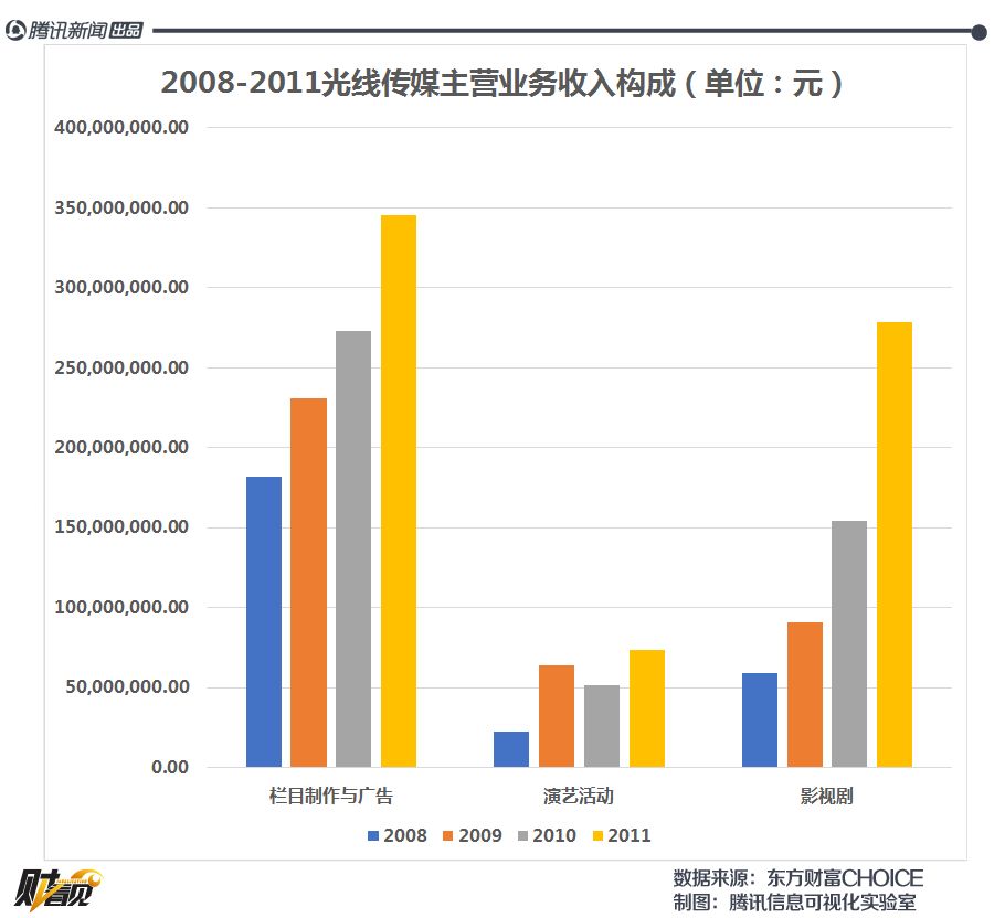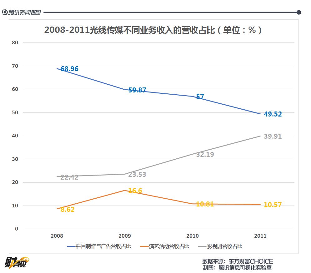 从2008年-2011年公司主营业务收入结构看,光线传媒栏目制作与广告的营收占比逐渐减少,从2008年的68.96%下降到2011年的49.52%,而影视剧的营收占比逐渐增加,从2008年的22.42%上升到2011年的39.91%。