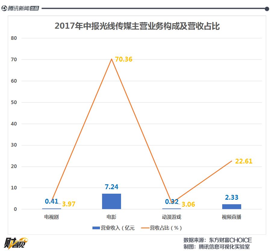 2011年公司上市后,光线传媒投资电影项目逐步增多。2012年主要收入构成还是栏目制作与广告+演艺活动+影视剧。2013年光线传媒主营业务收入构成发生变化,变成电视剧+电影+栏目制作与广告,2014年主营业务构成又增加了动漫游戏这一项。2016年和2017年的主营业务构成又增加视频直播这一项。