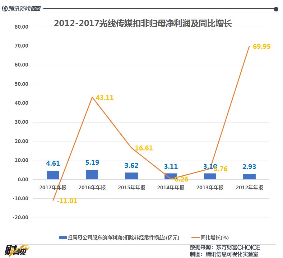 在扣非归母净利润同比增长上,没有出现超10亿票房爆款电影的2013年、2014年、2017年这三年的非归母净利润同比增长分别为5.76%、0.26%及-11.01%,与出现爆款年份的2015年的同比增长16.61%,2016年的43.11%相差甚远。