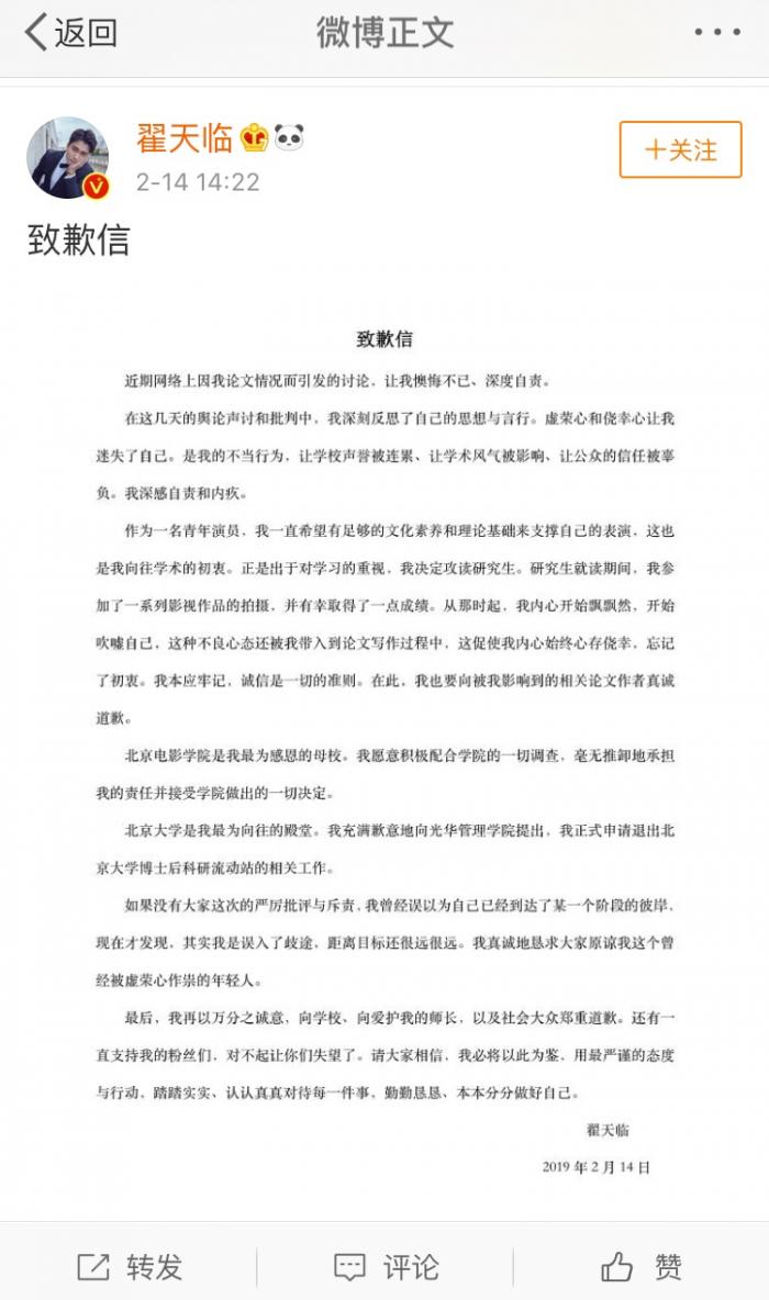 随后,翟天临在微博上发布道歉信表示:申请退出北大博士后科研工作,向学校、老师、社会公众郑重道歉。