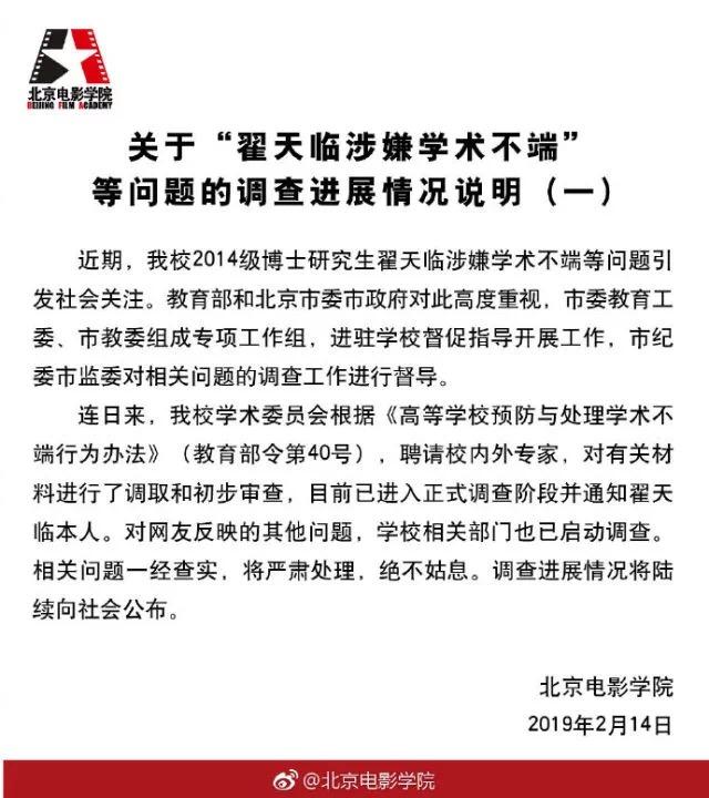 近期,北京电影学院2014级博士研究生翟天临涉嫌学术不端等问题引发社会关注。教育部和北京市委市政府对此高度重视,北京市委教育工委、北京市教委组成专项工作组,进驻学校督促指导开展工作,北京市纪委市监委对相关问题的调查工作进行督导。连日来,北京电影学院学术委员会根据 《高等学校预防与处理学术不端行为办法》 (教育部令第 40 号),聘请校内外专家,对有关材料进行了调取和初步审查,目前已进入正式调查阶段并通知翟天临本人。