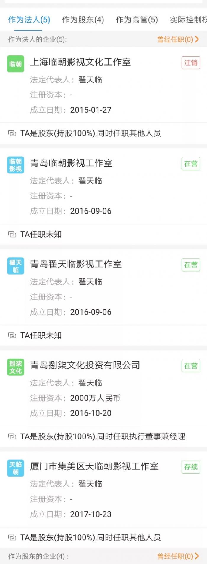 查询天眼查可发现,与翟天临有关的共有7家公司,主要涉及影视文化业务,其中,由翟天临100%控股的有3家公司,分别为:上海临朝影视文化工作室(已注销)、青岛捌柒文化投资有限公司、厦门市集美区天临朝影视工作室。