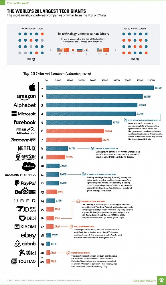 按已公开最新营收数据排列的全球互联网企业20强,欧洲无一席之地。图片来源:Visual Capitalist
