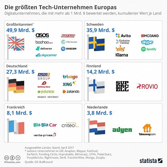2017年欧洲各国全国所有科技创新企业的估值/市值总和列表。腾讯4346亿美元可以匹敌英国全国。