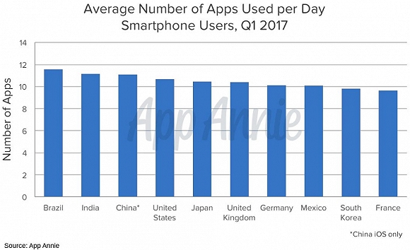各国用户每日打开的app数量,法国的数据明显落后于其它大国。图片来源:app annie