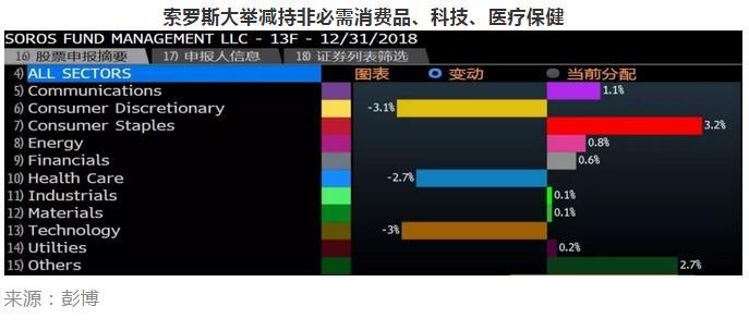 索罗斯目前以管理家族资金为主,资金量比巴菲特小很多,“船小好调头”。截至2018年12月31日,索罗斯基金管理公司在美股市场上的持仓市值为31.1亿美元,较前一季度减少9.5亿美元。非必需消费品、科技、医疗保健是索罗斯减持力度最大的三个板块,同时对耐用消费品板块进行了增持。