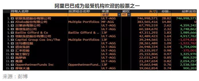 据彭博梳理,中概股阿里巴巴已成为最受机构欢迎的股票之一。截至2018年12月31日,贝莱德、普信集团、英国老牌投资机构Baillie Gifford、领航集团、道富集团、瑞银、施罗德、高盛、奥本海默基金、摩根大通以及部分对冲基金都大举增仓了阿里巴巴。