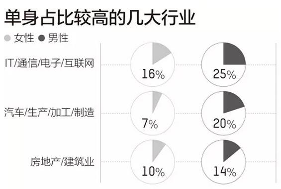 分行业看, TMT(科技、媒体、通信)行业成为单身者集中的领域——25%的单身男性和16%的单身女性集中在该行业以及相关领域。