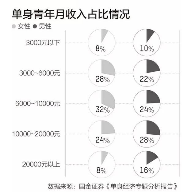 月入6000~1万元的水平,占女性群体的比重最高,为32%:而1万~2万元为单身男性占比最高的收入水平,占男性群体比重为28%。在月入2万元以上的水平上,男性占本群体比重高于女性8个百分点,为16%。