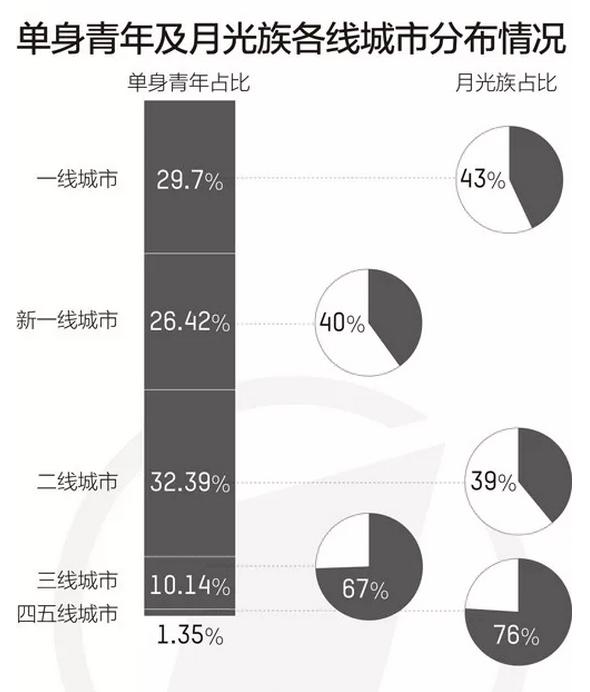 在一线、新一线和二线城市,40%左右的单身青年为“月光族”。随着城市等级向下及月收入降低,“月光族”比例大幅提升,四五线城市该比例达76%。