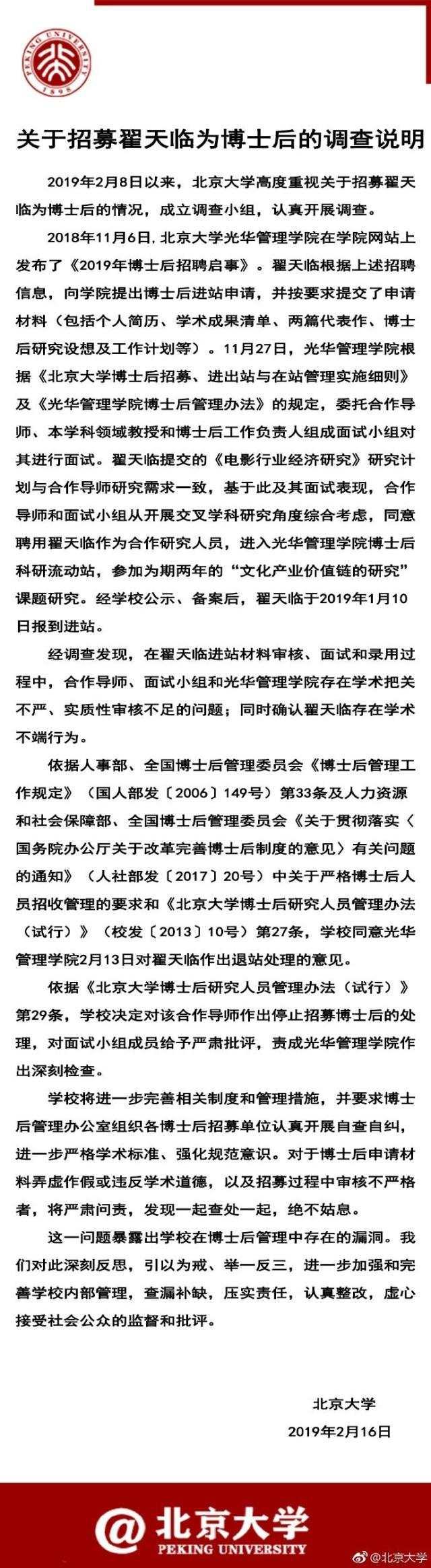 北京大学官方微博发布关于招募翟天临为博士后的调查说明:承认在学术把关不严、实质性审核不足的问题;同时确认翟天临存在学术不端行为。