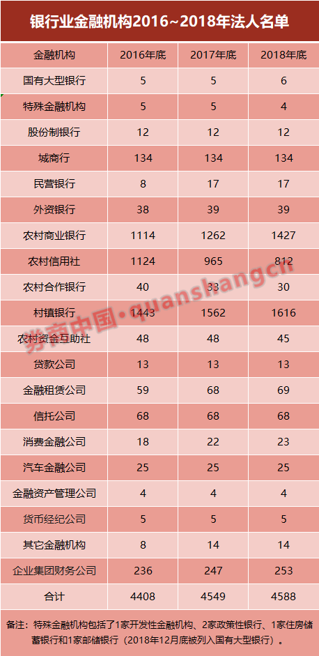 2018年底,中国银行业金融机构数量4588家,包括银行机构和各类非银机构。具体来看: