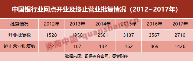 可供佐证的数据是,从整个银行业来看,虽然开业批复数量在逐年增加,但终止营业批复数量也在增加,且在2016年表现明显。零壹财经数据显示,2017年,银监会官网关于银行营业网点开业的批复约2710份,比上年减少857份,同期终止营业的批复达1426份,比上年增加557份。可以发现,银行营业网点开业批复在减少,关停的数量却逐年明显递增。