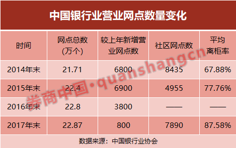 从2014年末到2017年末,我国银行业物理网点数量从21.71万个逐年增长至2017年末的22.87万个;但每年较上年新增的网点数量,从6800到6900,再到3800和800个,甚至是“断崖式”下降。与此同时,随着自助银行、网上银行、电话银行、手机银行迅猛发展,银行业金融机构网点服务离柜业务率在大幅提高,银行平均离柜率在2014年末是67.88%,但到了2017年末达到了87.58%。