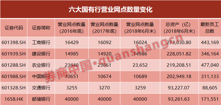 2017年末,我国银行营业网点总数22.87万,这之中,工、农、建、中、交行、邮储银行的网点总数合计达10.8万个,占比近一半。六大国有行在网点区域分布、数量规模的变化,折射整个行业的趋势。而且,除了银行网点铺设有着商业成本效益比、智能化转型去线下等诸多考量因素之外,国有行的营业网点铺设还有着践行国家普惠金融的使命任务。
