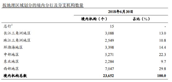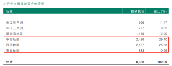 历史沿革特别的邮储银行在网点分布上特色更明显,其中部地区、西部地区和东北地区分支机构数目合计占比近67%;甚至远远超过了农业银行。