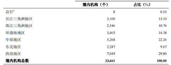 与此同时,国有大行一方面积极整合低产网点、集中优势资源,另一方面也积极落实国家普惠金融战略,新设网点向县乡域倾斜。在国有银行中员工总数最多(47.7万人)、网点数量高达2.3652万个的农业银行,分布于中部地区和西部地区的分支机构数占比52.1%: