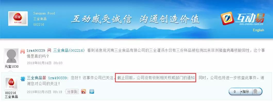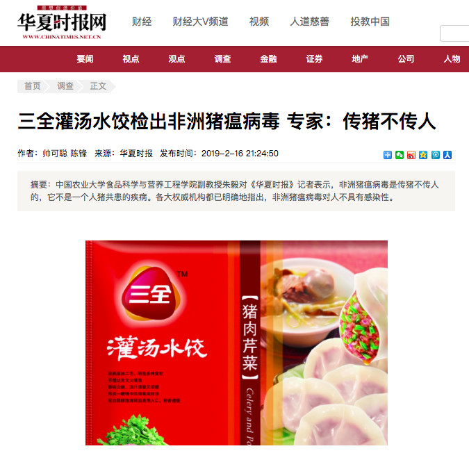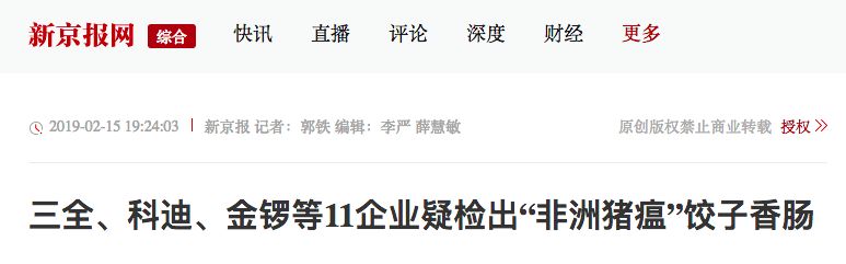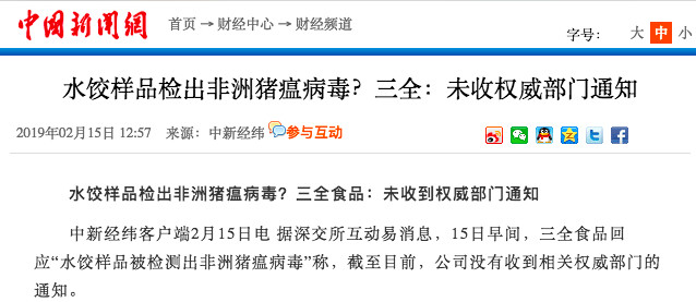 据红星新闻报道,多家媒体称,2月9日,湖南省湘西自治州重大动物疫病防制指挥部办公室接到省防治重大动物疫病指挥部办公室通知,要求泸溪县重大动物疫病防制指挥部办公室对来源于吉首市凌云冷冻食品批发部冻库的产品进行抽样,在泸溪县好又多和万家福两家超市共抽取4个批次12份样品,经州动物疫病预防控制中心检测,其中由河南三全食品有限公司生产批次为20190113H的“三全灌汤水饺”3份样品为非洲猪瘟病毒核酸阳性。