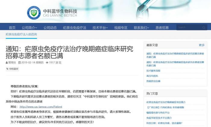 网传疟疾虫治疗癌症项目叫停 官网显示招募志愿者已满