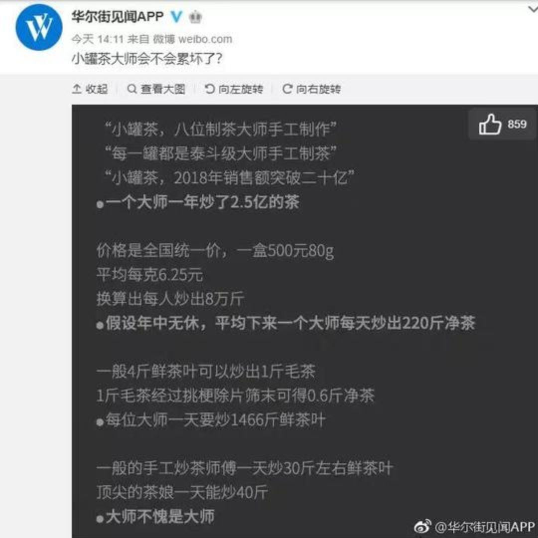 “小罐茶,大师作。”因为这句话,小罐茶卷入了虚假宣传风波。1月16日,有人给小罐茶算了一笔账:所谓八位制茶大师,全年无休,每天要炒220斤茶叶,而顶尖茶娘一天才炒40斤。“小罐茶大师会不会累坏了?”
