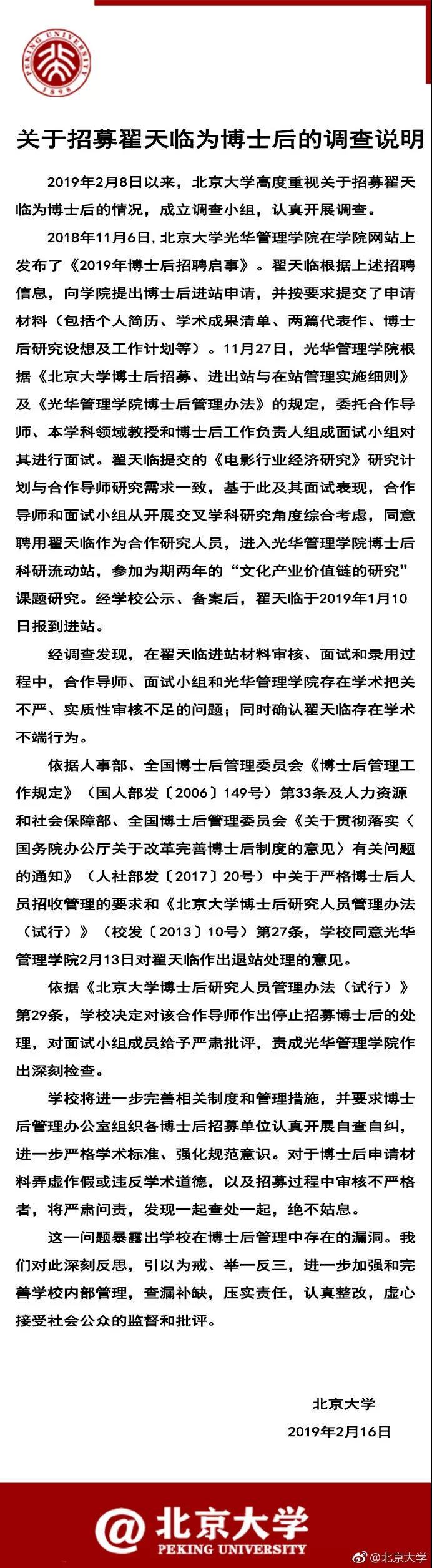16日,北京大学发布公告,承认在翟天临进站材料审核、面试和录用过程中,合作导师、面试小组和光华管理学院存在学术把关不严、实质性审核不足的问题;同时确认翟天临存在学术不端行为,决定对其作出退站处理,责成光华管理学院作出深刻检查。