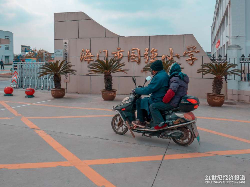 一辆电瓶车驶过海门国强小学门前。