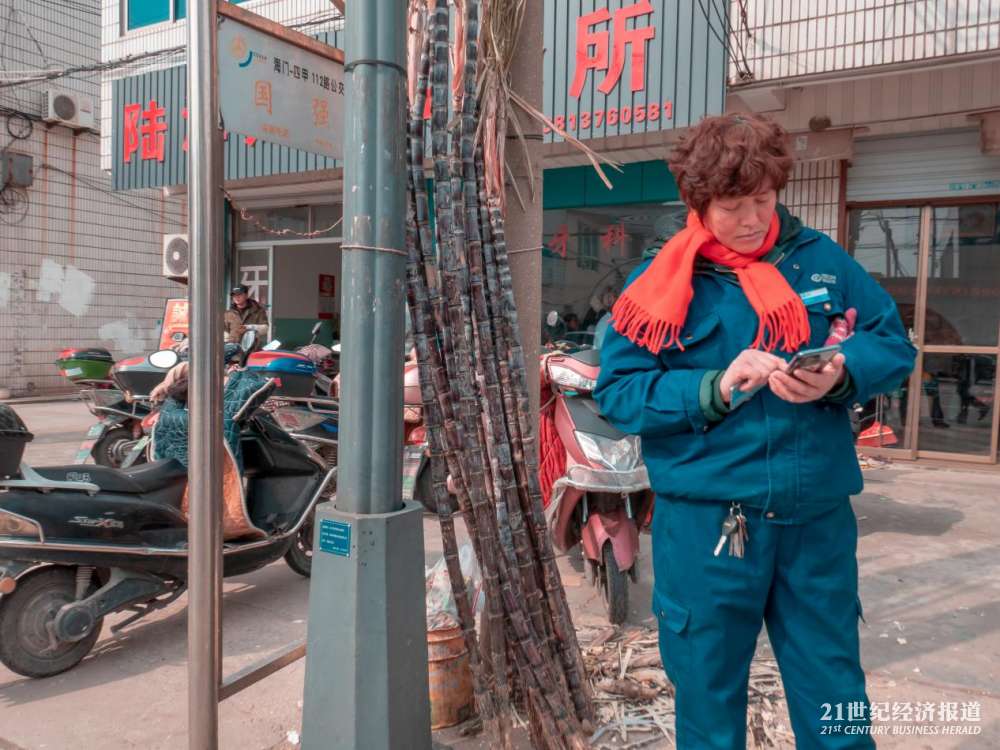 江苏南通海门国强镇街道,买甘蔗的村民。