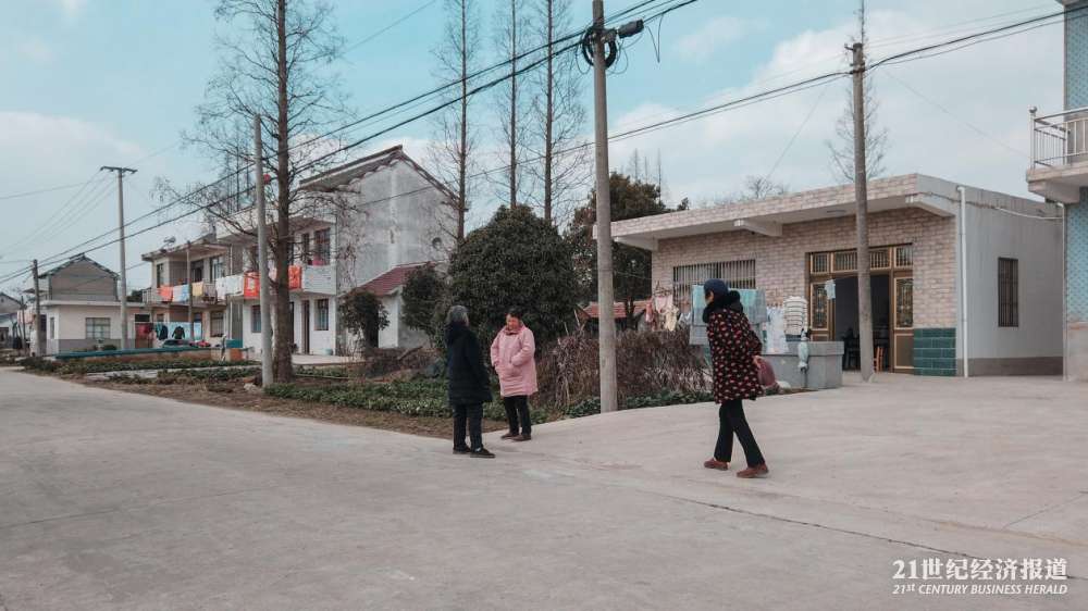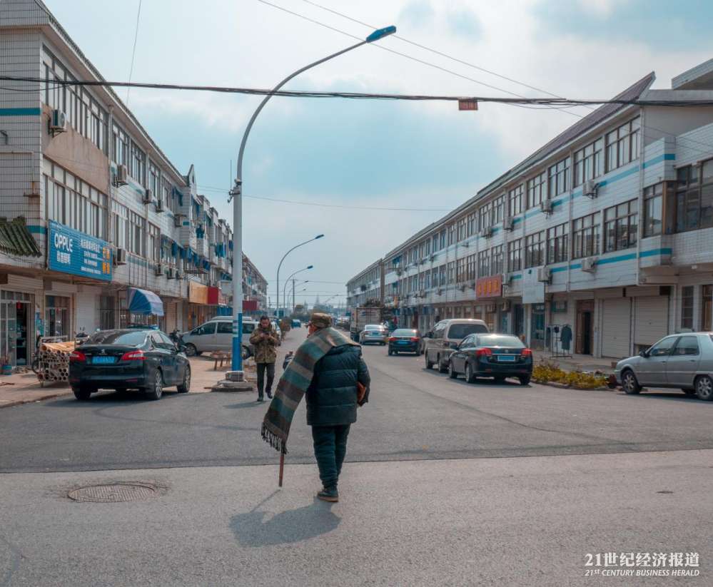 国强镇,披着围巾过马路的村民。