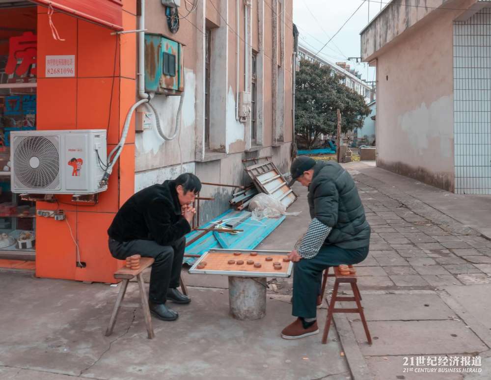 江苏南通海门国强镇街道边,下象棋的村民。