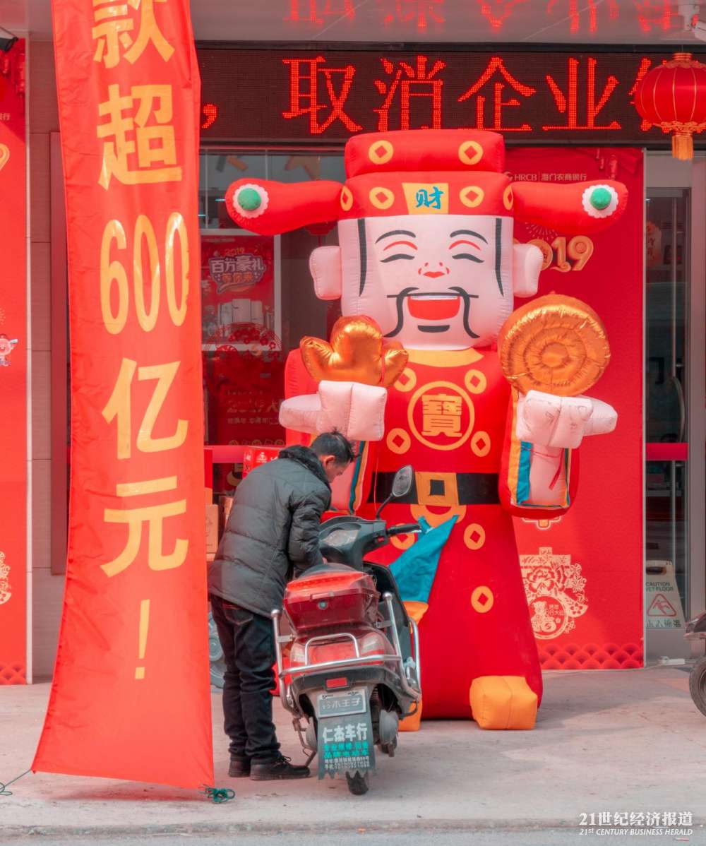 江苏南通海门国强镇农村商业银行门前,一位村民在财神爷面前取走自己的车。