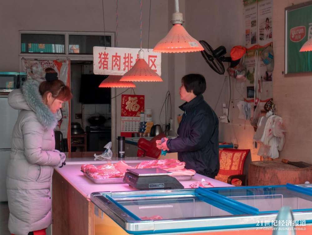 江苏南通海门国强镇肉铺,选购猪肉的村民。