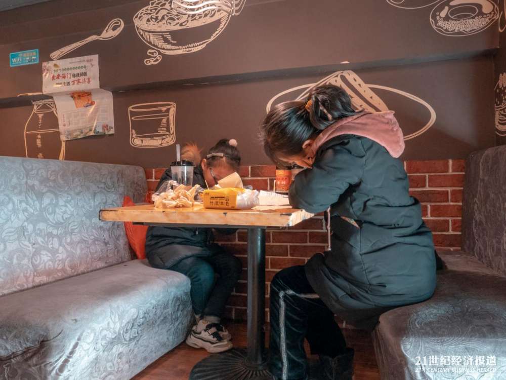 江苏南通海门国强镇,面包房雅座间写寒假作业的学生。