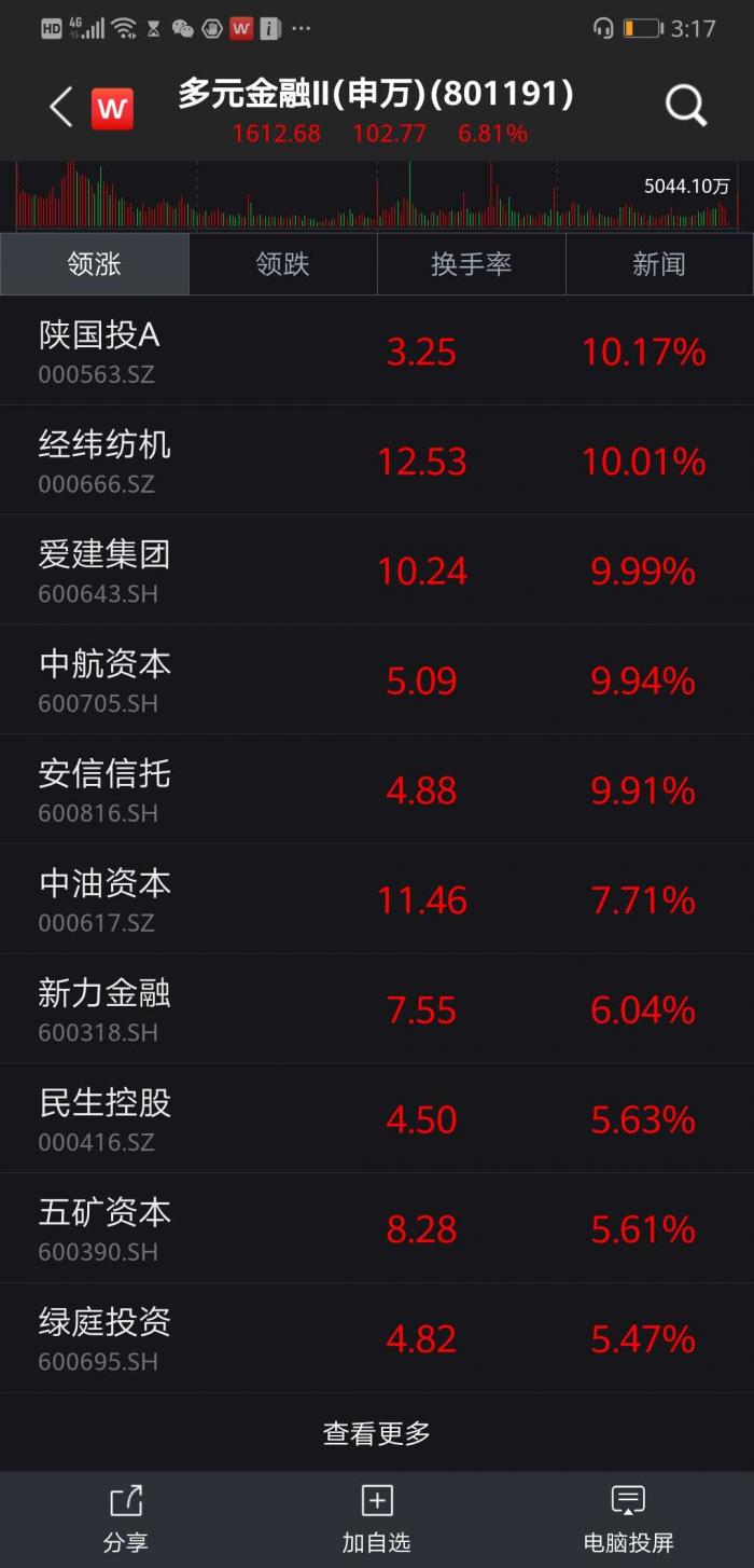 当日,多元金融II(申万)指数上涨6.81%,该指数主要涵盖信托、租赁概念股,相关股票全线上涨,其中信托概念股涨幅尤其明显。陕国投A、安信信托、经纬纺机、爱建集团、中航资本均现涨停。除此之外,中油资本、五矿资本也实现了超过5%的涨幅。
