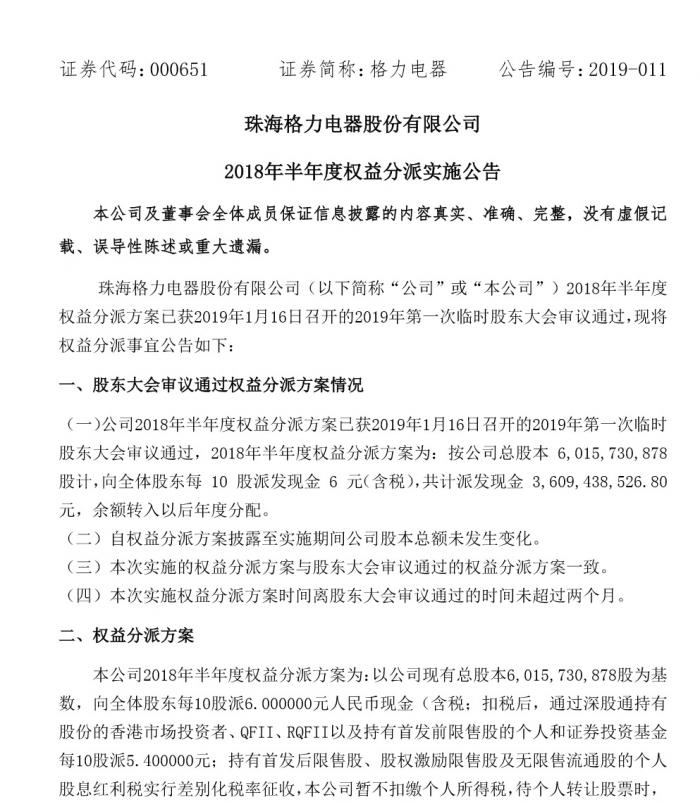 前一天深夜,格力电器公布2018年半年度权益分派方案,计划按公司总股本6015730878股计算,向全体股东每10股派发现金6元(含税),共计派发现金36.09亿元,余额转入以后年度分配。