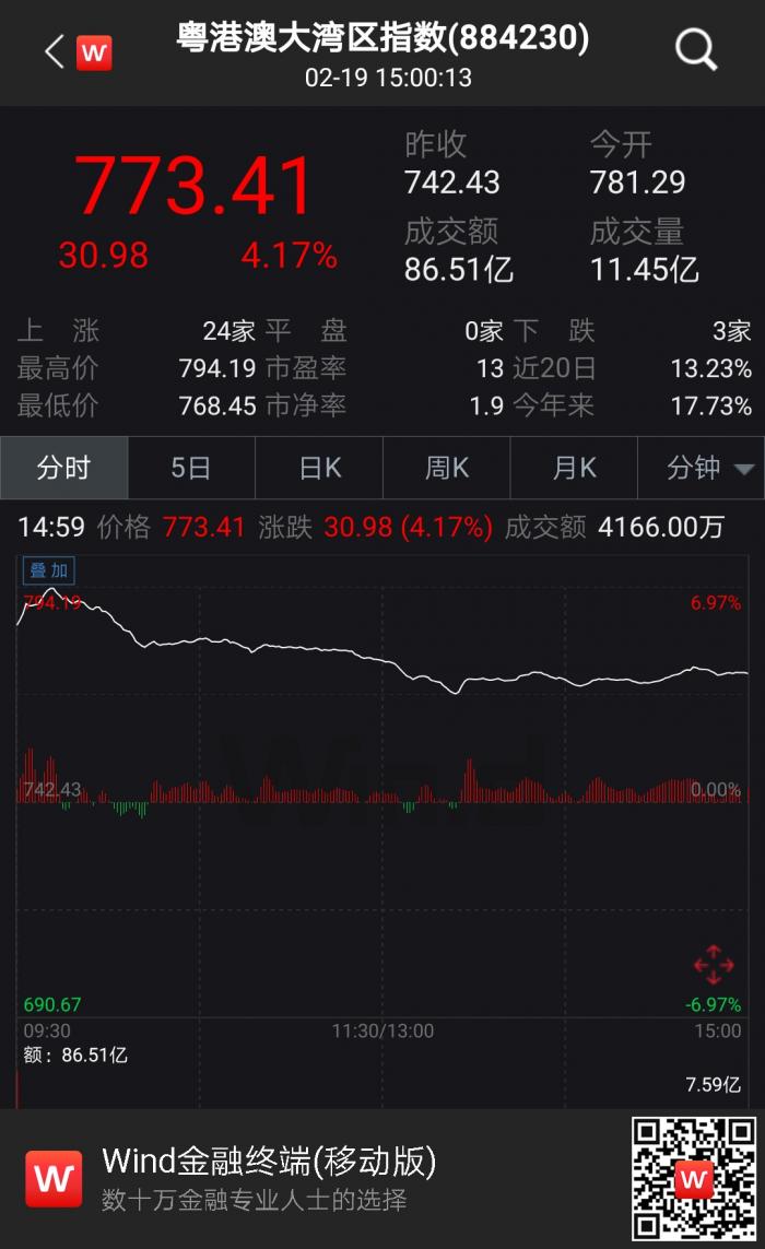 2月19日,wind粤港澳大湾区指数收盘大涨4.17%。珠江实业、盐田港、广州港、招商港口等十余股直线涨停,格力地产、南山控股、岭南控股大涨逾5%。
