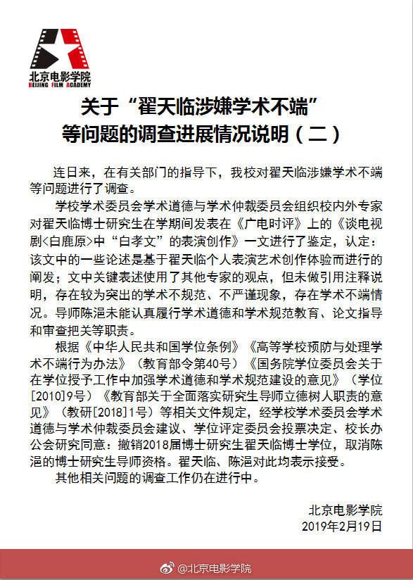 据北京电影学院微博消息,北京电影学院决定撤销翟天临博士学位,取消陈浥博导资格。通报全文如下: