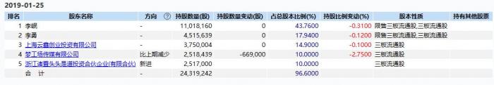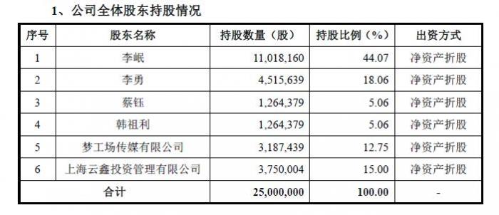 Wind数据显示,截至2019年1月25日,李珉、李勇、上海云鑫创业投资有限公司、梦工厂传媒有限公司、浙江诸暨头头是道投资合伙企业(有限合伙)为其前5大股东。