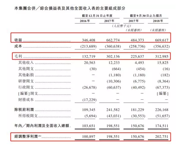 公司的财务业绩方面,受对辅助升值服务的需求不断增加所推动,不孕症在全球变得愈来愈普遍,2016年至2017年,公司实现收入3.46亿元、6.63亿元,截至2018年9月30日止9个月,公司实现收入6.7亿元,经调整净利润自2016年-2017年分别为1亿元、1.99亿元、2.03亿元。