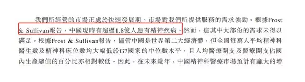 康宁医院2015年赴港上市招股书中引用了市场研究顾问公司Frost&Sullivan的报告,中国现时有1.8亿人患有精神疾病,按照14亿总人口计算,我国患有精神疾病的人口比例为13%,即每8人当中就有1人患有精神疾病。