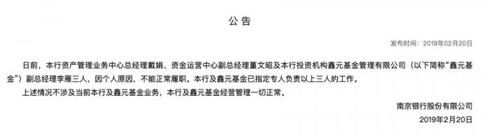 2月20日中午,南京银行官网发布公告称,南京银行资产管理业务中心总经理戴娟、资金运营中心副总经理董文昭及该行投资机构鑫元基金管理有限公司(以下简称“鑫元基金”)副总经理李雁三人,因个人原因,不能正常履职。南京银行及鑫元基金已指定专人负责以上三人的工作。
