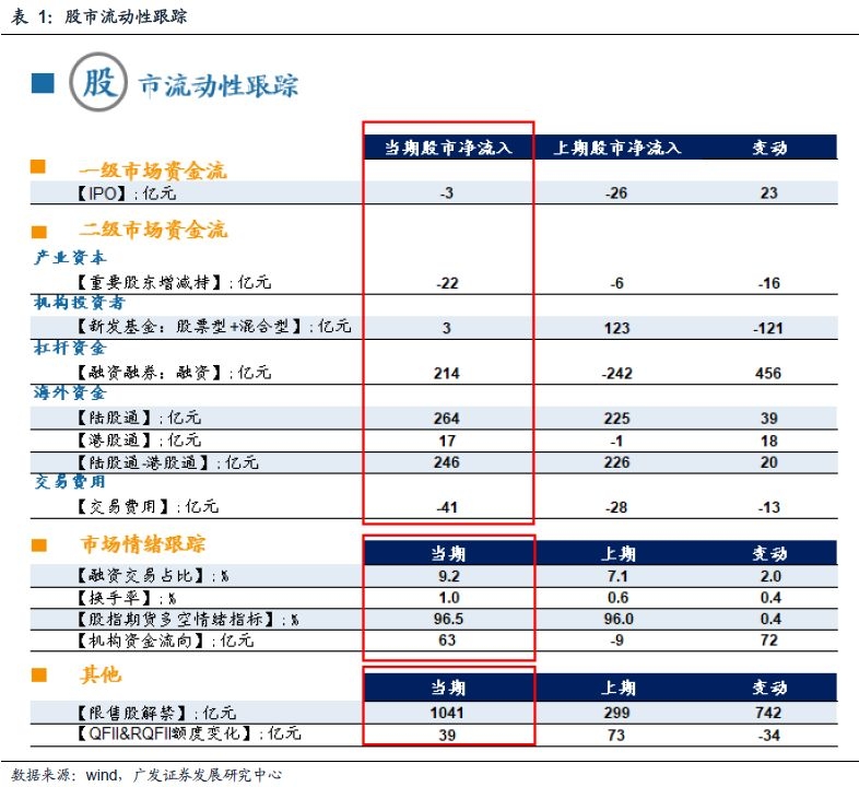 二级市场:上周陆股通北上资金净流入叠加两融融资余额上升,A股整体呈现净流入态势。资金流入方面,陆股通北上资金大幅净流入264亿元,两融融资余额增加214亿元,国内新发基金(股票型+混合型)规模3亿元。资金流出方面,重要股东增减持22亿元,交易费用41亿元。