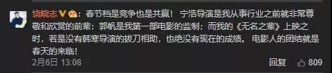 春节档是竞争也是共赢! 宁浩导演是我从事行业之前就非常尊敬和欣赏的前辈;郭帆是我第一部电影的监制;而我的《无名之辈》上映之时,若是没有韩寒导演的拔刀相助,也绝没有现在的成绩。 电影人的团结就是春天的来临!