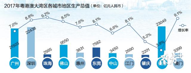近年来,粤港澳大湾区总体经济增速一直保持在7%以上,高于全国平均增速。数据显示,2017年,粤港澳大湾区GDP约10万亿元,直逼世界第一湾区东京湾区。其中,珠三角地区生产总值7.58万亿元,增长7.9%,香港、深圳和广州GDP均突破2万亿元。