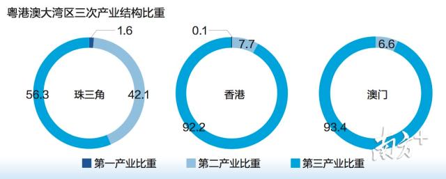 昔日的“世界工厂”在产业结构上也不断优化升级,珠三角三次产业结构比重调整为1.6:42.1:56.3,逐步形成以战略性新兴产业为先导、先进制造业和现代服务业为主体的新型产业结构。各城市产业特色鲜明,珠三角九市和香港、澳门相互间优势互补,紧密协作,联动发展。
