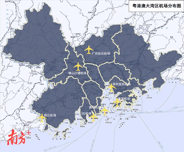 粤港澳大湾区机场群由香港国际机场、澳门国际机场、广州白云国际机场、深圳宝安国际机场、珠海金湾机场、惠州平潭机场、佛山沙堤机场七大机场组成。